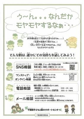 う~ん。。。なんだかモヤモヤするなぁ・・・ 投稿: HP担当 (07:59) 千葉県子どもと親のサポートセンターより、相談事業についてお知らせが届きました。 SNS相談(LINE)とワンストップ・オンライン相談(Zoom)を通じて、友人、親子、先生との関係や学校生活などの悩みに専門のカウンセラーが応えます。 下記のチラシよりご確認ください。 子サポ資料.pdf